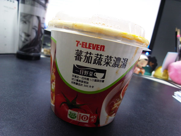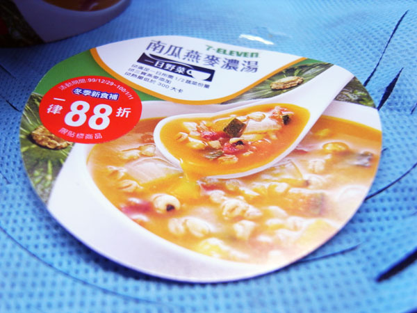 午餐原來沒想法也沒計劃,是怕晚上又亂吞一堆有的沒的才到7-11晃晃,看到南瓜濃湯居然吞口水咧..... 重點是88折啦。